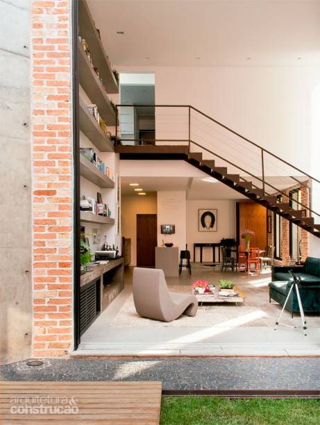 Os espaços principais se concentram num grande bloco, sem telhado e com materiais brutos à mostra, realçando o feitio industrial. Na área de convivência há poucas divisórias, efeito obtido pela estrutura de concreto armado que atravessa a moradia de lado a lado e possibilita vãos de até 6 m nos ambientes.