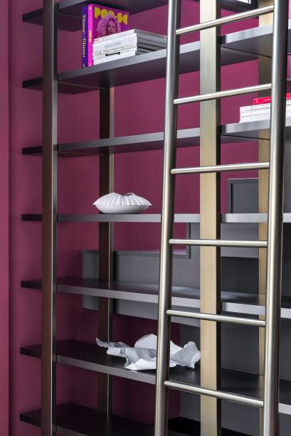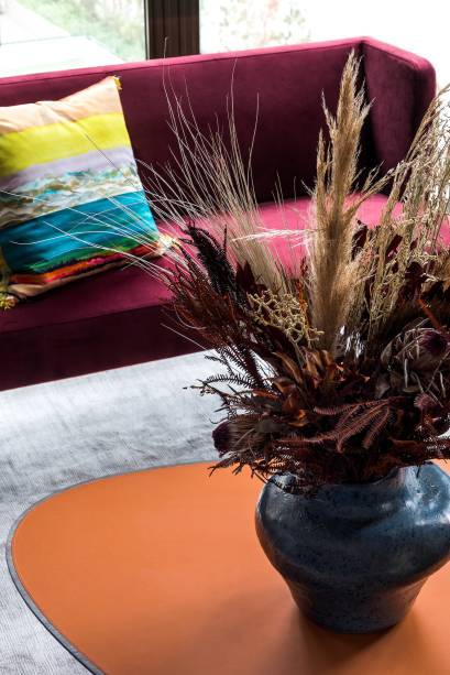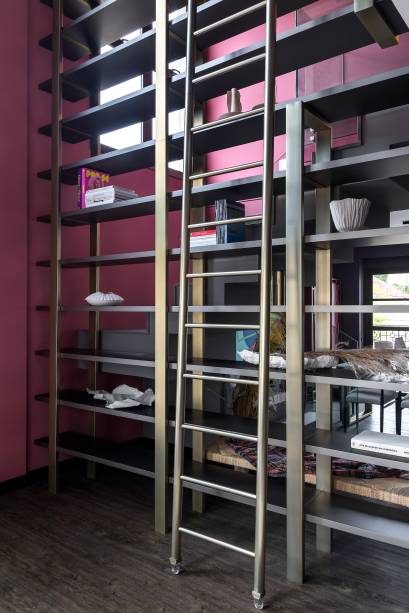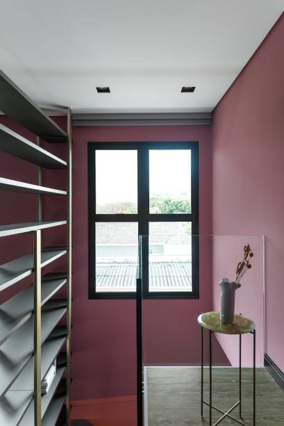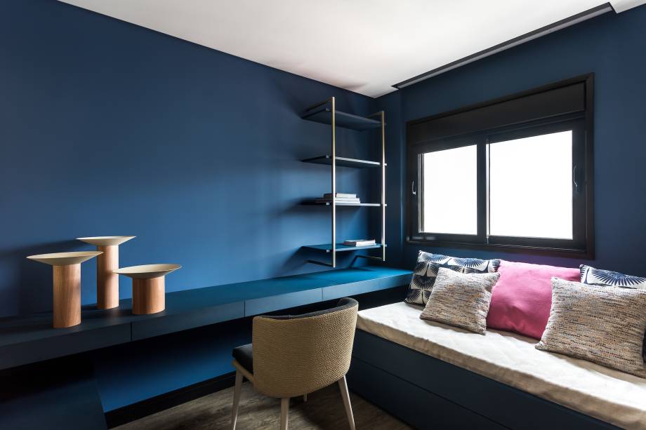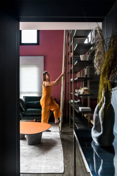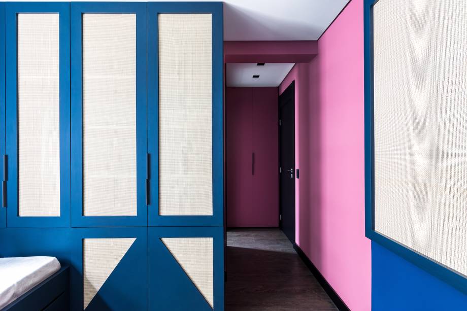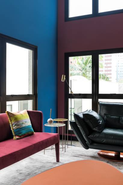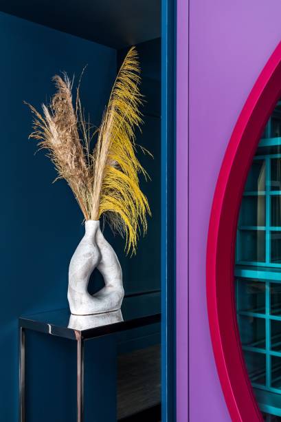 Aliando inovação, qualidade, originalidade e cor, o projeto se destaca logo na entrada com uma “caixa azul” que prepara o visitante, deixando o destaque para o living. Ao centro está uma estante para objetos e livros que divide o espaço acompanhando o pé direito duplo. Uma adega circular é a grande protagonista deste espaço – sua mistura de cores e formas garantem personalidade e ousadia tão desejadas pela moradora.