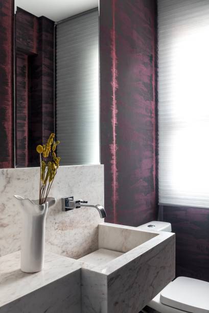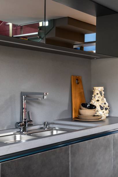 O espaço de jantar fica integrado com a cozinha gourmet, que possui um acabamento escovado e eletrodomésticos ocultos. Já o espaço de jantar ganhou a cor rosa e tem um armário todo desenhado pelo escritório, feito na antiga técnica de marchetaria, resgatando esse trabalho tão utilizado no passado e que tem muito valor histórico.