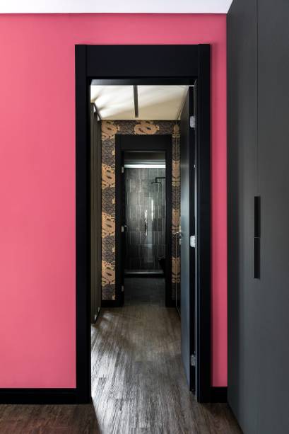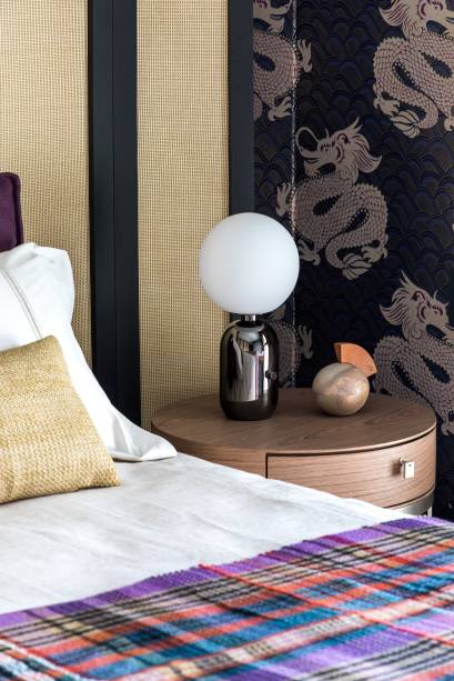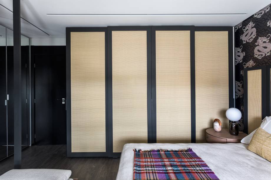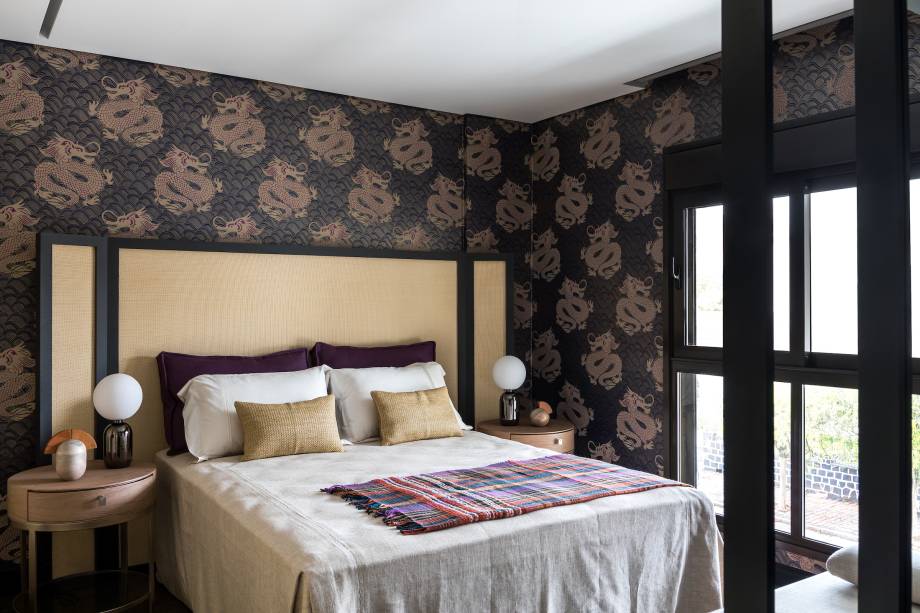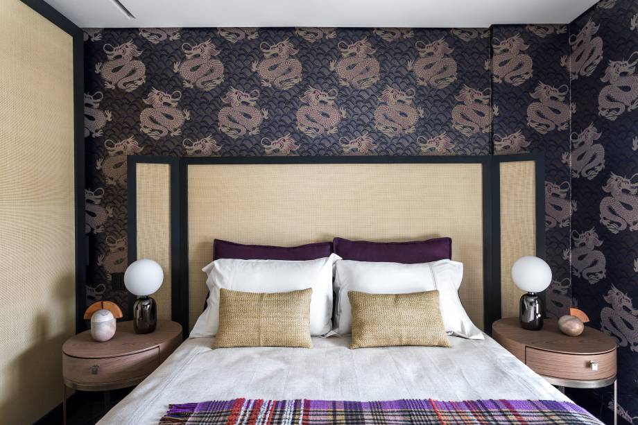 No pavimento superior, o quarto ganhou destaque com um importante elemento oriental, o dragão, presente com grande força no papel de parede. Ele traduz tudo o que foi pensado inicialmente no apartamento e, a partir dele, outros elementos – como a tela da cabeceira e as cores escolhidas para a roupa de cama – foram definidas.