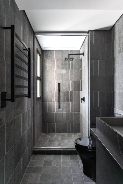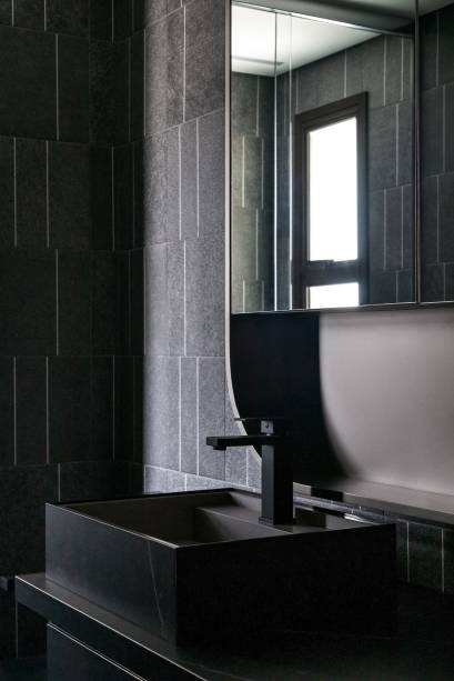 Seguindo essa pegada mais oriental e escura, o banheiro master foi pensado de maneira a se imaginar estar em um spa. O revestimento escolhido tem textura agradável e dá a sensação de oásis.