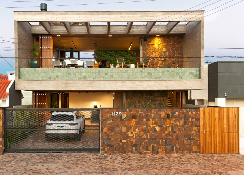 O escritório responsável, Mayresse Arquitetura, apostou em um volumetria pura de concreto aparente, com piscina de borda infinita que também funciona como cobertura para os carros.