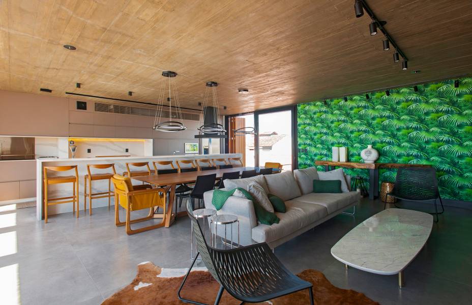 No projeto de interiores, a premissa foi manter o brutalismo do concreto aparente, contracenando com acabamentos em madeira natural presentes em peças assinadas por designers – como a mesa de jantar em louro freijó e ripados de madeira utilizados no fechamento das esquadrias.