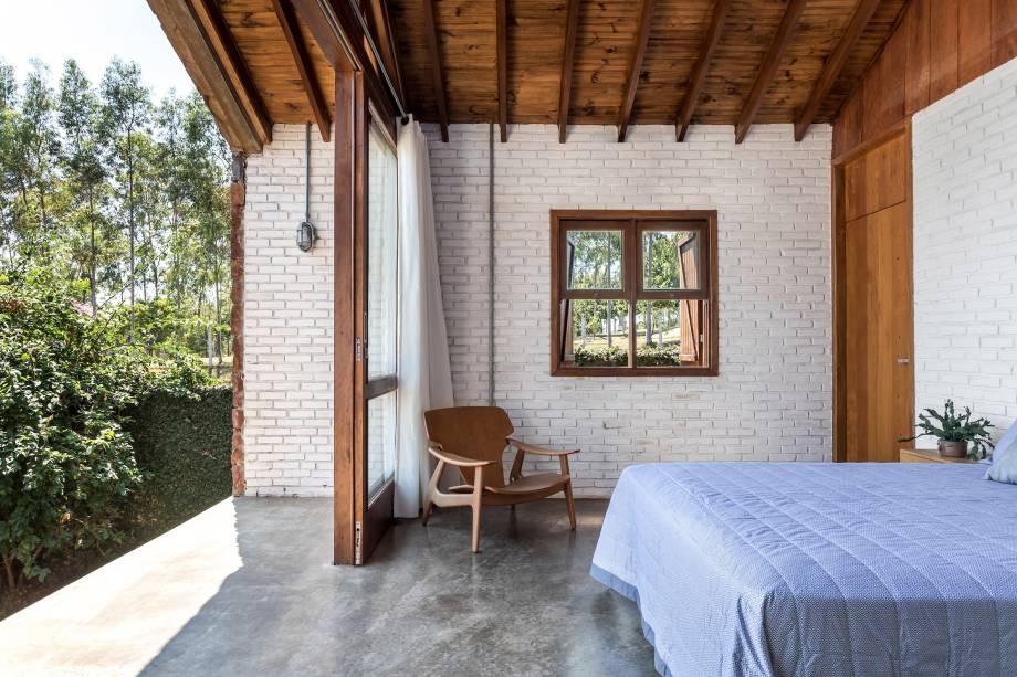 No bloco com a área íntima da casa, ficam os três quartos que a compõem com destaque para a suíte principal. Todos ambientes da morada possuem vista para lago, mas a suíte do casal ganhou um belvedere privado.