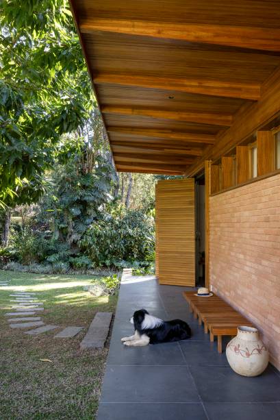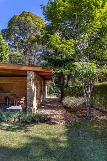 Como a casa principal do terreno tem tijolinhos pintados de branco, as arquitetas decidiram construir a casa de hóspedes com tijolos aparentes, em tom natural terracota, criando, assim, uma unidade estética no conjunto arquitetônico. Para a cobertura, usaram um sistema construtivo eficiente, de montagem rápida, com material mais tátil que remetesse à uma casa de campo: um telhado em vigas de MLC (madeira laminada colada, de reflorestamento, com origem certificada), que é mais leve que o convencional e permite criar grandes vãos.