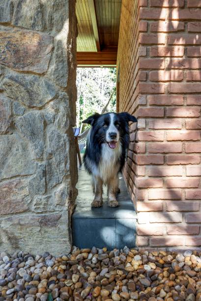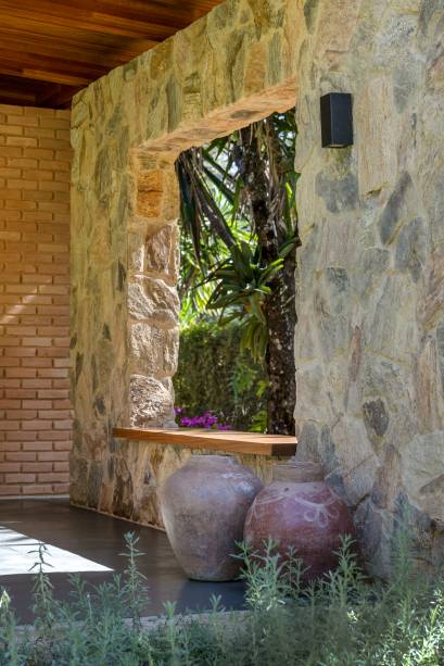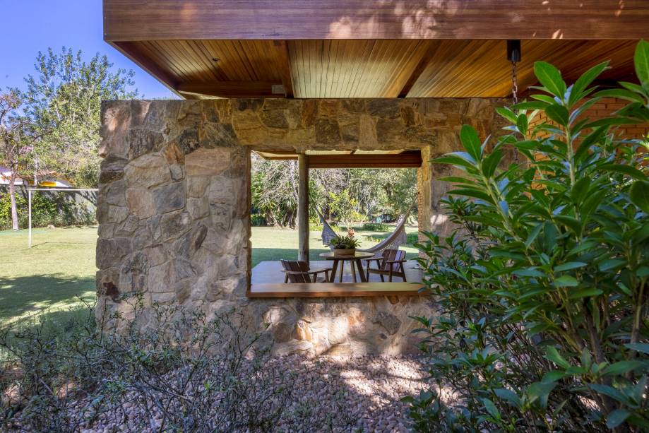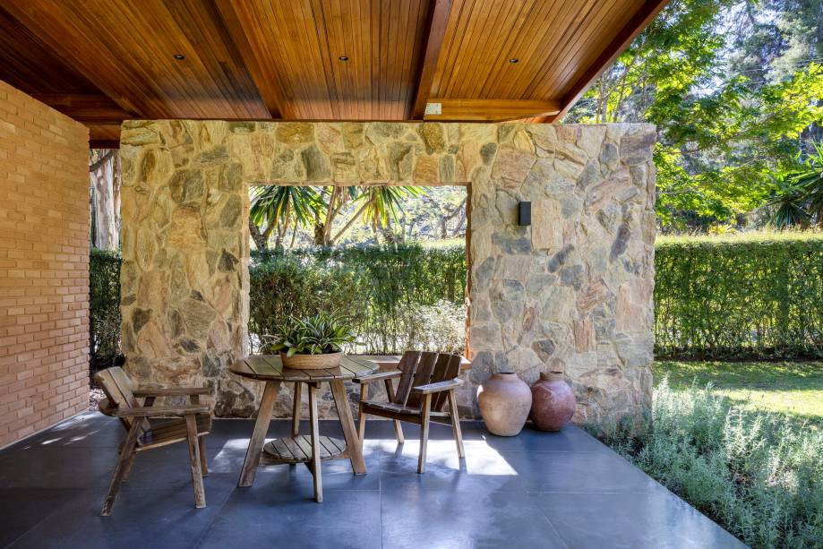 Na varanda lateral, foi projetado um muro de pedra bruta vazado no meio (com um pranchão de madeira na base), não só para delimitar a área da varanda como também proteger este espaço da proximidade com a rua. Para que as varandas externas e o interior da casa ficassem melhor integrados, todo o piso foi revestido em pedra ardósia, material natural fácil de encontrar e de custo mais acessível que funciona nas duas situações. “Usamos placas grandes, de 90x90cm, para caber na modulação da varanda frontal”, detalha Fabiana.