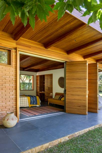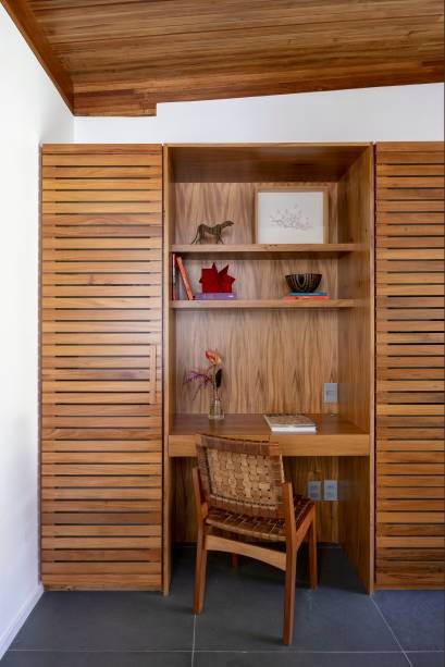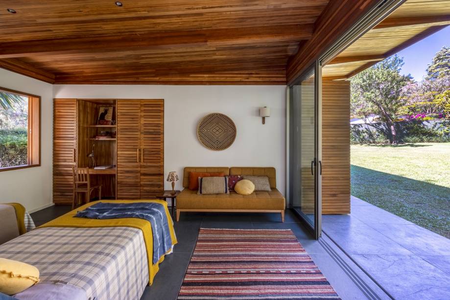 “Além do desejo de ter mais espaço para receber confortavelmente os amigos e a família composta por dois filhos casados e cinco netos, eles também queriam que o teto fosse forrado com madeira de demolição. Arrematamos um lote generoso de lambri de peroba-do-campo e usamos a sobra do material para fazer boa parte dos armários e a cabeceira da cama de um dos quartos”, conta a arquiteta.