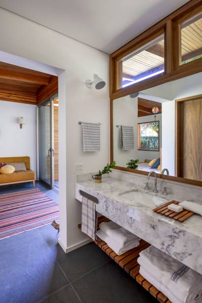 Já os itens de decoração, entre tapetes, tecidos, quadros e objetos, são do acervo pessoal da família. Nos banheiros, as arquitetas também usaram materiais tradicionais e simples, com destaque para as bancadas em mármore branco nacional e a área do chuveiro, que foi revestida com pastilhas brancas, de 5x5cm.
