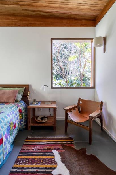 Na decoração, de estilo atemporal, todos os móveis utilitários, como as camas e mesinhas de cabeceira, são novos e foram adquiridos no Ateliê Fernando Jaeger, priorizando peças de linhas mais simples e neutras.
