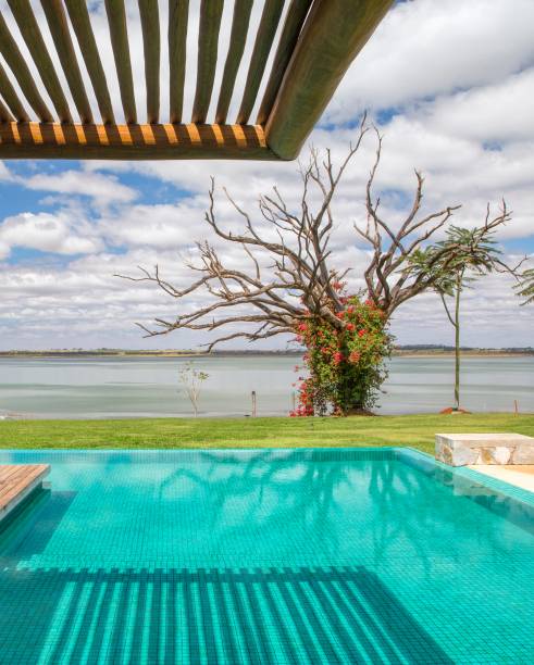 A casa é composta de três módulos principais, interligados por pergolados ladeados por jardins: o módulo social compreende sala de estar, jantar e cozinha, que são totalmente integrados e voltados para a área externa; o módulo privativo concentra quartos e banheiros e, por isso, seu layout é mais fechado; por fim, o módulo de lazer inclui a área externa voltada para a represa, com ambiente de estar e espaço gourmet cobertos e piscina descoberta.