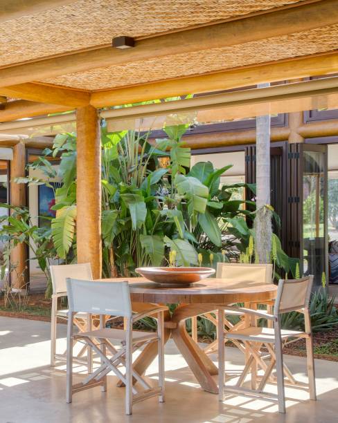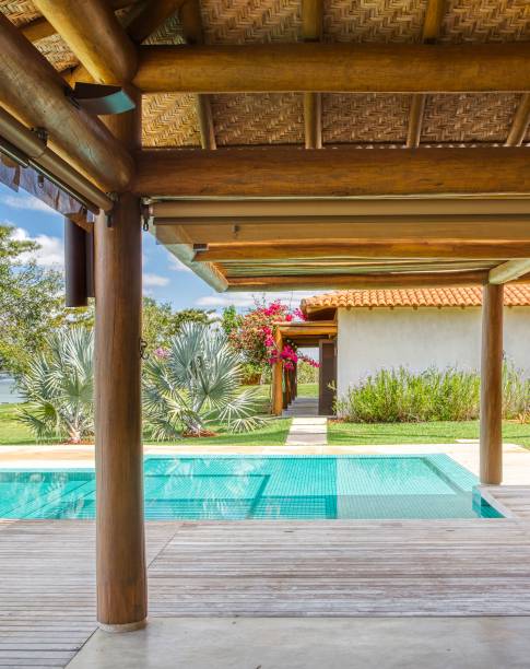 Inspirada em uma pousada, a casa foi construída com estrutura em pau roliço (toras) de eucalipto reforçada por vigas metálicas, paredes de alvenaria, esquadrias de madeira com portas venezianas de madeira ou vidro transparente, forro em taquara (casca de bambu trançada) e piso de tecnocimento na cor cinza claro, sendo uma parte da área externa em deck de madeira.