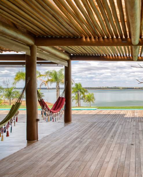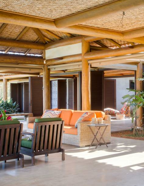 A casa de campo térrea foi projetada do zero pela arquiteta Solange Calio com uma estrutura de toras de eucalipto reforçada por vigas metálicas.