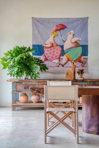 Para receber as obras de arte coloridas e alguns móveis estofados com tecidos estampados do acervo dos clientes, a arquiteta adotou tons neutros e claros como base da paleta cromática, como o chão cinza claro e as paredes brancas. Nos espaços externos, foram priorizados tons mais terrosos e naturais, em sintonia com a vegetação e a represa que forma um lago na frente da casa.