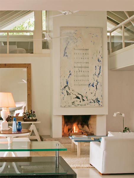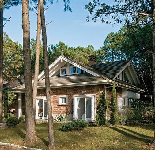 A ideia do casal era ter um pequeno mezanino na futura casa de praia e ocupá-lo somente com o ateliê de pintura da proprietária. Mas, após algumas conversas, a arquiteta alterou o esboço inicial. Os clientes citaram seu gosto pelas construções de Punta del Este, no Uruguai, nas quais o telhado é bastante significativo. Por isso, dei tanta importância a ele, diz Bruna Charak Jany, de Porto Alegre. Auxiliada pelo engenheiro Alberto Fridman, a moça planejou uma cobertura com oito águas para a morada em Atlântida, a 130 km da capital gaúcha. O formato do conjunto e a altura da cumeeira (6 m) determinaram, então, que não houvesse apenas um mezanino acanhado, mas sim um segundo pavimento de 126 m², onde figuram estar íntimo com lareira e um quarto de hóspedes.