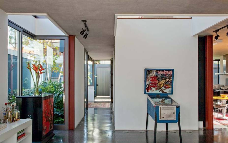 Anos e anos morando num sobrado geminado que ocupava quase todo o terreno levaram o proprietário desta casa em São Paulo a umaconclusão singela mas importante: bom mesmo é viver cercado de verde. Por isso, quando ele herdou o lote vizinho, tratou de encomendar ao arquiteto André Vainer o projeto de uma casa nova e espaçosa – na medida de seus três flhos – e repleta de jardins. A localização e o zoneamento municipal permitiriam o raro privilégio de erguer três pavimentos e avistar a mata do Parque Ibirapuera. Com a área aumentada a 602 m2, também daria para implantar a obra no centro dos dois lotes, rodeando-a de vegetação. Como a ideia não era apenas criar recantos contemplativos, mas usufruir deles, oarquiteto planejou uma grande varanda no térreo, horta, além de terraços nos andares mais altos. “Pensei numa casa toda aberta embaixo e mais fechada em cima. Um jogo de vazio e cheio, leve e pesado”, explica. Para alcançar esse resultado, ele lançou mão de uma estrutura de concreto que se sobrepõe à de aço e depois tingiu tudo de azul.