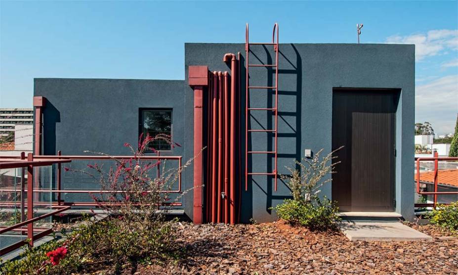 Os pilares ganharam uma tonalidade que imita o óxido de ferro, em referência ao material que compõe a estrutura. Tinta vermelho henna, ref. 30YR 14/365, da Coral.