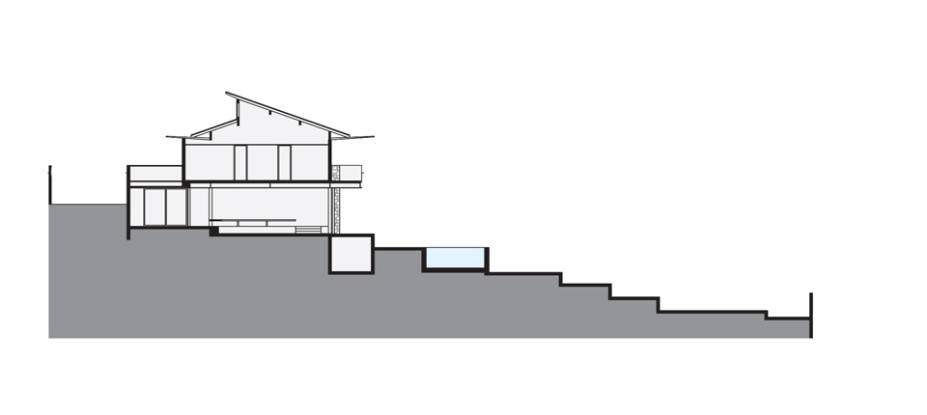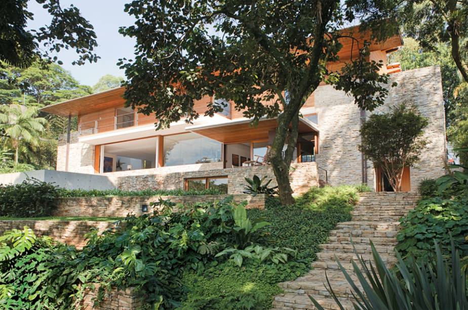 Nesta casa construída em um terreno inclinado, verde e construção convivem em harmonia.