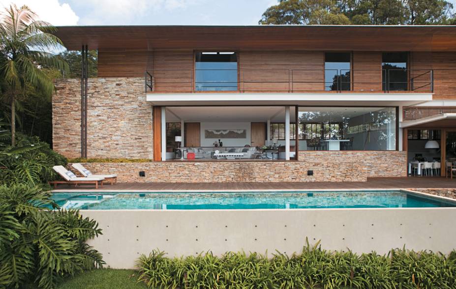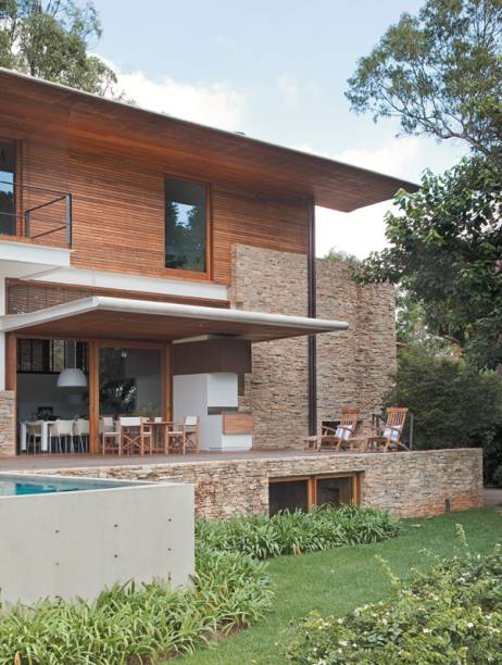 Pedra, madeira, vidro e concreto. A futura casa ainda habitava o plano dos sonhos, mas os materiais já estavam certos na cabeça dos proprietários, um casal de arquitetos. Apesar da formação, eles preferiram contratar um profissional que exercesse o ofício para dar vida a uma arquitetura atemporal e limpa, com espaços abertos para o verde em plena São Paulo. Muita pesquisa depois, se encantaram com o perfil do escritório de Mauro Munhoz, conhecido por seus trabalhos que respeitam a natureza. “A arquitetura é feita de vários elementos do terreno, uma pedra, uma árvore ou a forma do chão”, fala Mauro. “Melhor ainda do que considerar a topografa é valorizar o lugar. A casa não pode ser um volume fechado em si mesmo”, continua.