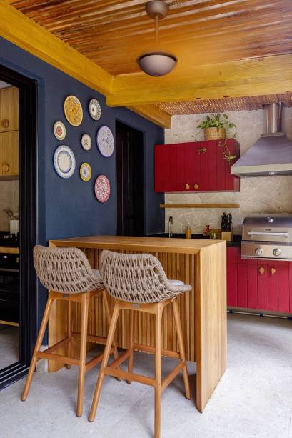 A fachada na cor azul, padrão do condomínio, foi o ponto de partida para o mix de matizes adotado pela arquiteta, buscando imprimir autenticidade e aconchego aos ambientes. “Ao contrário do meu apartamento em Salvador, que é bem neutro, queria uma casa de praia com cores e estampas. A cor predominante nos interiores foi o verde, presente no papel de parede dos quartos, para trazer a mata para dentro. Já nos armários da área gourmet adotei o tom marsala, criando um contraste com o azul da fachada e combinando com nossos pratos decorativos – compramos um prato em cada cidade que passamos na lua de mel, na Costa Amalfitana”, revela Juliana.