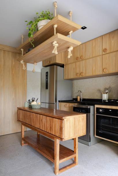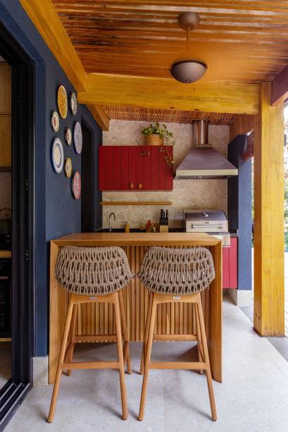 A arquiteta e sua família desejavam uma obra rápida, com o mínimo de intervenção e bastante marcenaria planejada, para aproveitar todos os cantos disponíveis. “Na reforma, realizada em três meses, transformamos a despensa em um banheiro, para atender à área externa, instalamos um aquecedor na piscina e criamos um deck, estendendo a área gourmet. Piso e bancadas foram mantidos de acordo com a entrega da construtora”, lista Juliana.