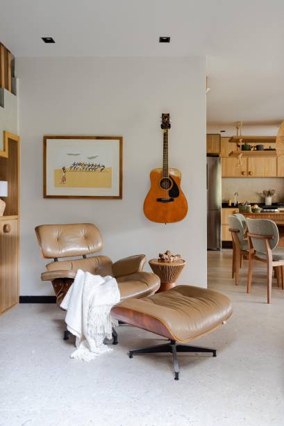 A composição do mobiliário conta ainda com móveis de área externa da Tidelli e mesa, cadeiras e sofá da sala de estar da Domi Interiores. Já a poltrona Charles Eames, o aparador da cozinha, o sofá da sala de TV e o conjunto de cabeceira e mesa de apoio, da suíte principal, são do acervo do casal.