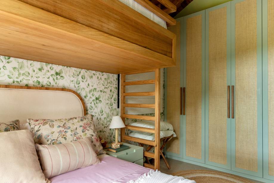 Para trazer um ar de praia contemporâneo despojado para a morada, Juliana apostou em texturas como madeira, sisal, palha e tecidos naturais, presentes em móveis e acessórios. A marcenaria em louro freijó, desenhada pela arquiteta e executada pela MN Armários, é um dos destaques do projeto – é o caso do beliche das filhas, feito em madeira maciça.