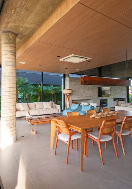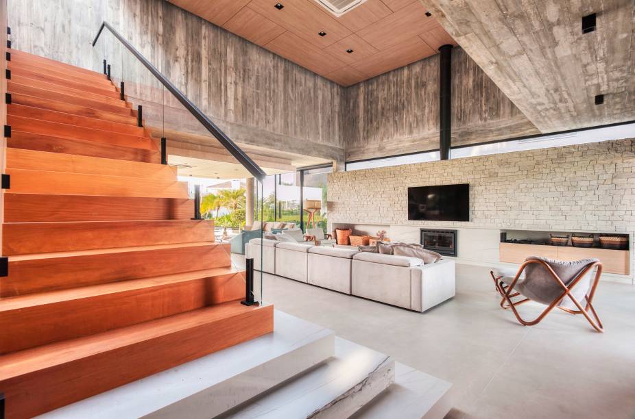 O imóvel de dois pavimentos apresenta traços brutalistas, com ambientes amplos e integrados. No térreo, a sala de estar, jantar e espaço gourmet formam a área de convivência e lazer conectado à piscina de transbordo.