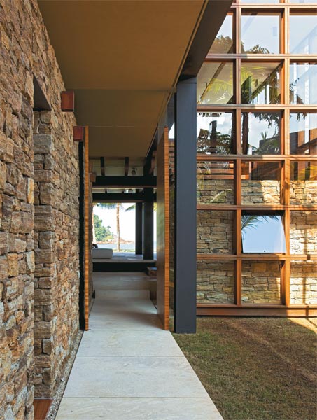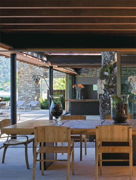 Mesmo um terreno que aparentemente parece perfeito pode guardar seus senões. Mas isso não atrapalhou o arquiteto paulista Gui Mattos, que, acostumado a trabalhar no litoral f luminense, sabia como pensar a implantação desta casa numa praia próxima a Paraty, RJ. Naquele pedaço da costa, a face privilegiada pela vista do mar recebe ventos frios e pouca luz, revela. Por isso, embora não pudessem faltar vidros para contemplar as ondas, era no lado oposto que estava a claridade. Gui traçou uma planta quase inteiramente térrea, de maneira a evitar obstáculos à passagem do sol, e abriu a construção também para a rua do condomínio. Assim, a luz natural entra pela fachada da frente e consegue alcançar todos os cômodos, inclusive os quartos da família, únicos que compõem um segundo andar, explica. Resolvida a insolação, surgiu outro pedido: manter intocado o chapéu-de-sol existente no lote. O que poderia ser um problema revelou-se um trunfo graças à sombra fornecida pela copa da árvore, o recanto gourmet e parte do deck junto à piscina ficaram ainda mais fresquinhos.