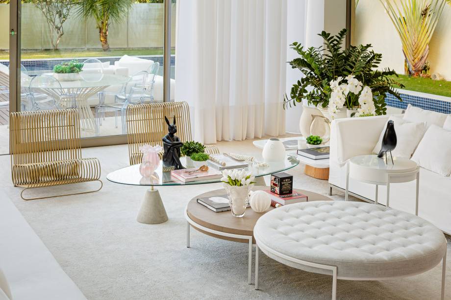 Este projeto se destaca pelos detalhes, como as poltronas Soto de Ronald Sasson, em metal dourado, que se confundem com uma obra de arte. O cantinho mais colorido da casa recebeu chaise redonda giratória e um alegre tapete Missoni multicolorido.