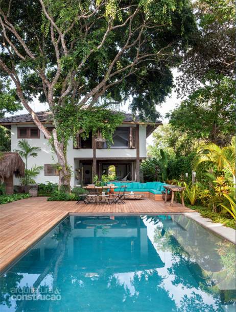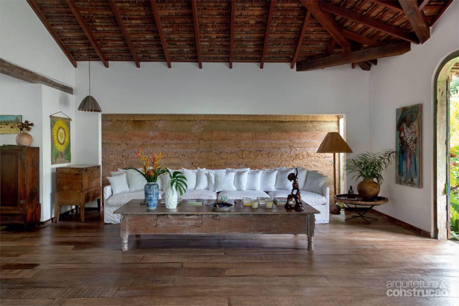 O cenário não poderia ser mais atraente: Trancoso, no litoral sul da Bahia. Há oito anos, o jornalista André Lattari saiu da capital paulista para gerenciar um empreendimento hoteleiro no charmoso vilarejo. Pouco tempo depois, chegou a vez de a arquiteta Daniela Oliveira trocar o interior de Minas Gerais pelo trabalho no mesmo projeto de André. A sintonia dos dois extrapolou a área profissional. Hoje, eles não apenas têm um escritório de arquitetura na região, o Vida de Vila, como também moram juntos há seis anos. “Depois de passarmos algum tempo construindo para os outros, decidimos fazer isso por nós no terreno que eu tinha num condomínio fechado”, relembra ele. E o velho ditado “casa de ferreiro, espeto de pau” fez todo o sentido ao longo do processo. “Levamos quase dois anos para finalizar os desenhos e começar a empreitada”, confessa André. Nesse período, o casal amadureceu as soluções, fez uma reserva financeira para bancar a construção e garimpou muito material nos confins da Bahia e de Minas Gerais. “Misturamos nossas origens. Eu contribuí com o astral das antigas fazendas mineiras, graças às peças típicas herdadas da família, enquanto André agregou ideias modernas e, principalmente, sustentáveis ao projeto”, diz Daniela. De um curso de permacultura ele trouxe a inspiração para uma parede de barro na sala de estar. As fôrmas de madeira usadas na elaboração deste fechamento serviram, depois, de estrutura para o banheiro próximo à piscina. Metade das taubilhas (telhas de madeira) veio de demolições. A vantagem, segundo André, é que a matéria-prima velha dilata e retrai menos para se adaptar ao ambiente. “Só precisamos incluir uma manta aluminizada na sobreposição das telhas de modo a impedir a entrada de água.” Quanto à marcenaria, o morador reforça que a região conta com excelente mão de obra. Outra influência local: as portas do tipo baia, usadas nos chalés de hóspedes, estão presentes na maioria das casinhas do Quadrado, centro histórico e turístico de Trancoso. “Juntando tudo isso, buscamos uma arquitetura atemporal, com a mescla e a reciclagem do que fosse possível”, resume a arquiteta e moradora.