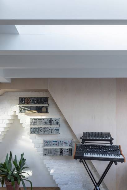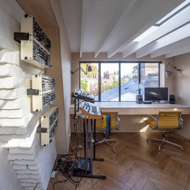A família que morava nesta casa geminada no Reino Unido precisava de mais espaço para fazer música e planejar sessões de fotos, junto com um novo quarto de hóspedes e muito espaço de armazenamento.