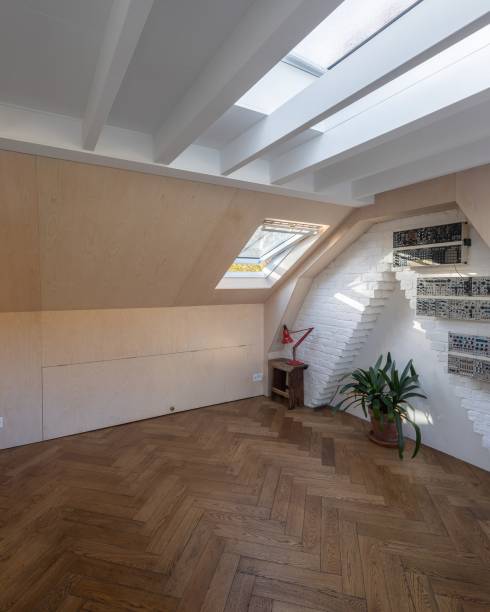 O loft é acessado por uma escada de aço e carvalho, ecoando os materiais da escada original e indicando o espaço contemporâneo acima. Extensos vidros no teto abobadado permitem que a luz penetre profundamente na casa.