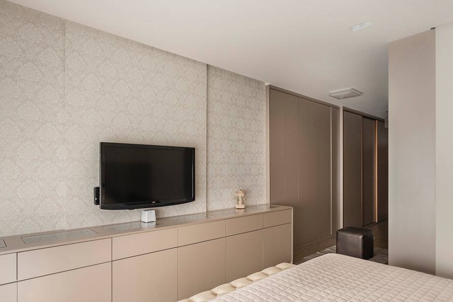 No quarto do casal, a elegância está presente em diversos detalhes especiais. A estampa clássica do papel de parede, a sobriedade leve da marcenaria, além da delicadeza das cortinas, que proporcionam uma luminosidade agradável, são alguns exemplos disso.
