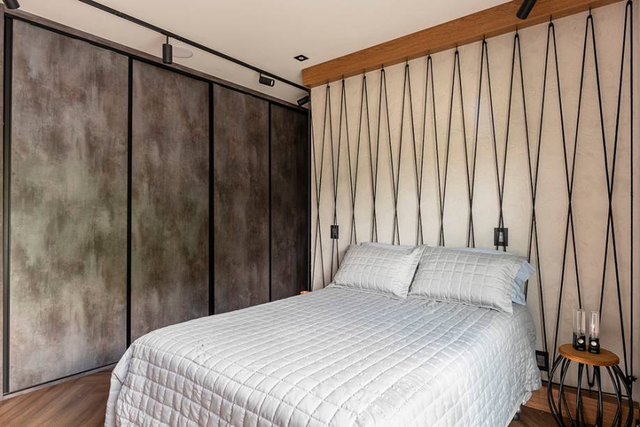 No quarto do filho, existe um mix entre o conforto da madeira e a descontração dos elementos industriais, como a presença de metais pretos nas prateleiras e a iluminação de trilhos. O cantinho para estudar e trabalhar ganhou nichos especiais com serralheria. Completando, uma mesa ampla e um armário de rodinhas para ter tudo à mão!