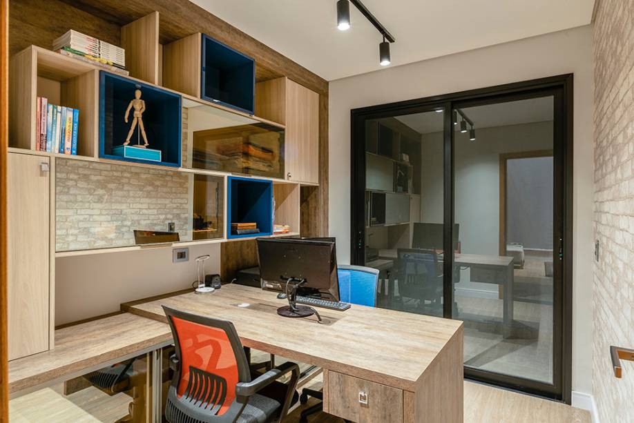 Hoje em dia, o home office não pode faltar, não é? Aqui, a opção foi pela marcenaria clara, que torna o ambiente mais nítido para trabalhar com conforto. Os nichos de tamanhos diferentes trazem descontração, com o azul em evidência.
