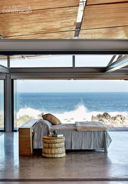 O toque final coube às engenhosas venezianas motorizadas. Quando abertas, elas basculam 90 graus para dar acesso à vista e filtrar o sol, enquanto, abaixadas e trancadas, oferecem segurança. Motivo de orgulho, a solução envolveu o trabalho de um especialista em mecanismos para cinema e arrematou o pedido do cliente, interessado em acompanhar de perto os ciclos da luz e dos ventos, o passar dos dias e das estações. Do terraço com os amigos ou mesmo da cama, agora ele contempla todas as situações: o pôr do sol na serra, a chegada das baleias-francas e a ininterrupta arrebentação.