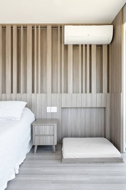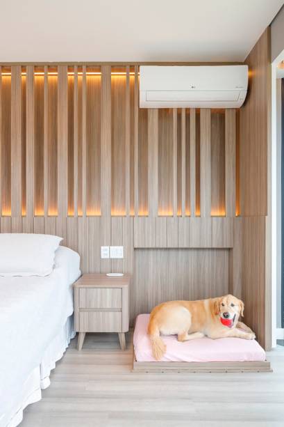 Para a suíte máster, a demanda era por um canto próximo à cama do casal para o pet da família pernoitar. Assim, foi criado um painel com profundidade mínima que ocultou a caminha retrátil do cachorro.