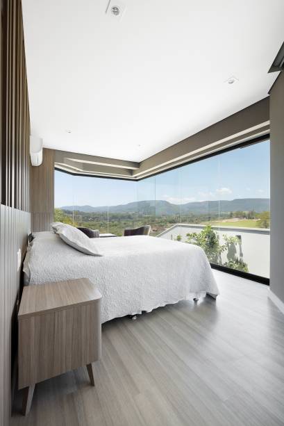 O privilegiado pé-direito e a vista para a paisagem ao redor foram devidamente explorados, preservando o intimismo desejado. A paleta de cores, que contempla madeirados, preto, branco, couro caramelo e nuances de cinza, foi norteada pelo gosto dos clientes por tons neutros.