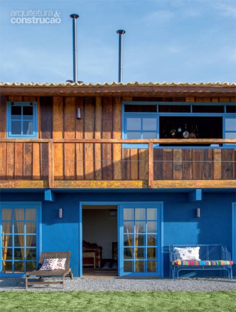 No corpo principal, enxuto, há duas amplas suítes e todos os ambientes convergem para o estar, integrado à cozinha. “O dono adora cozinhar. Foi essencial montar uma sala aberta e com o forno a lenha à vista. Ali, é onde tudo acontece. As refeições da família são encontros longos e memoráveis”, diz Sonia, que assumiu o tom natural da madeira – e suas diferenças de peça para peça – em praticamente todos os espaços, mas tingiu as esquadrias. “Essa mistura rejuvenesce o visual da fachada. E azul é nossa tonalidade preferida”, revela o proprietário.