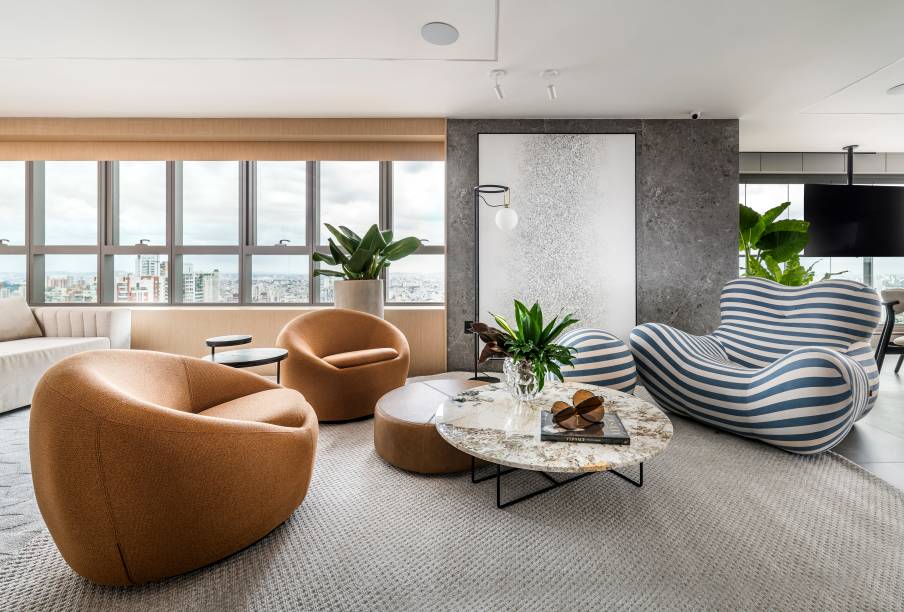 O lounge, logo na entrada, traz assentos giratórios junto à poltrona Up, do designer italiano Gaetano Pesce.