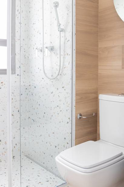 “Utilizamos cores dominantes neutras, como o tom de madeira e a cor branca, e cores de destaque, como a cor cinza na área social, a cor azul na suíte do filho e tons de marrom na suíte master, tendo como objetivo transmitir tranquilidade e leveza”, revela arquiteta.