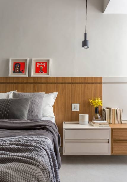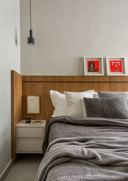 “Eliminamos o cachimbo demolindo a parede do quarto vizinho à sala e no lugar da antiga alvenaria instalamos portas de correr, com esquadrias de madeira e vidro canelado, que permitem isolar ou integrar o atual home office, que também funciona como quarto de hóspedes”, explica o arquiteto.