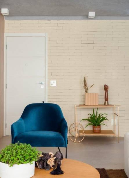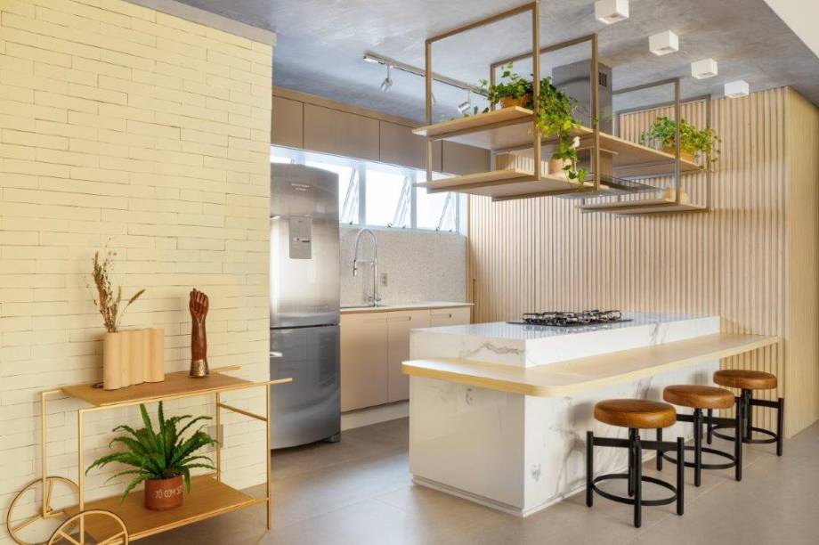 A mescla de estilos, no entanto, foi pensada a partir de uma paleta neutra. “Queríamos levar contrastes por meio de materiais com os mesmos tons, mas trazendo personalidade, como por exemplo o revestimento ‘tijolinho’ e porcelanato do closet/banho”, esclarecem Lucas e Bruno.
