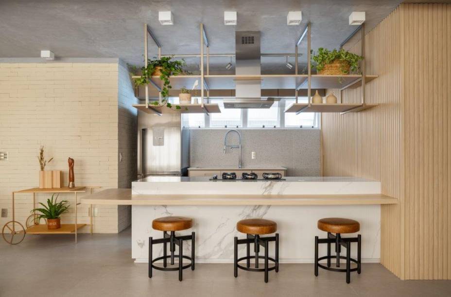 Análise do baguá e Feng Shui norteiam o projeto desta cobertura na Vila Mariana Neste apê, estante metálica branca é divisória e floreira para jiboias e costelas-de-adão