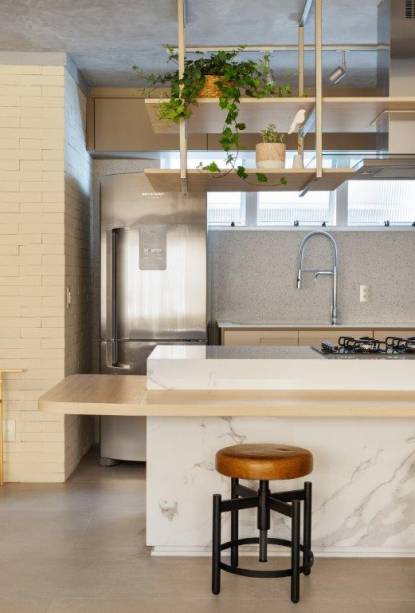 Com mescla de estilos, o apartamento tem ares de casa e possui elementos contemporâneos, rústicos, clássicos, industriais e românticos. E é essa mescla que cria identidade ímpar ao lar. Bancadas marmorizadas, metais black e o amadeirado nos móveis soltos foram utilizados de maneira harmônica.