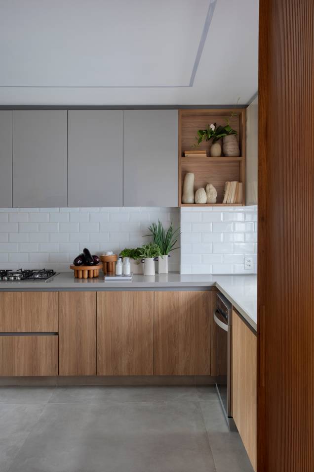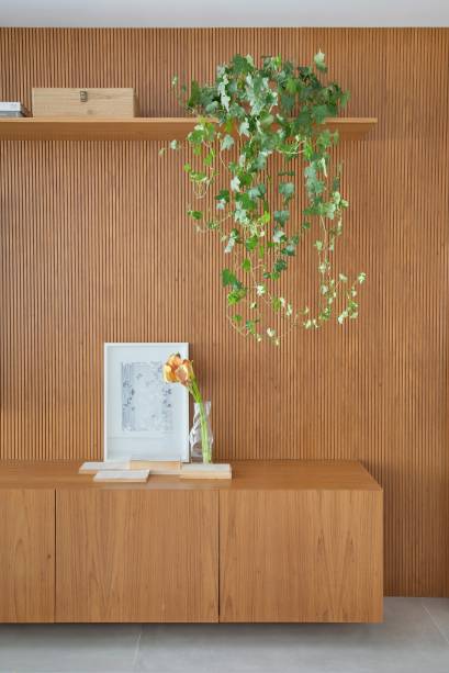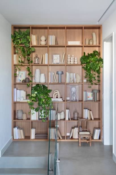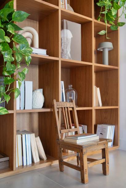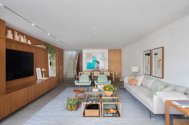 “Procuramos selecionar peças de mobiliário leves e elegantes, com estruturas delicadas e soltas do piso, e design minimalista, sempre valorizando as linhas retas”, pontua Juliana. Na área social do andar inferior, as arquitetas trabalharam com tons de cinza e madeira sobre uma base arquitetônica neutra.