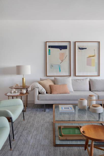 “Para obter uma decoração chique e atemporal, utilizamos uma paleta de cores suaves apenas em alguns elementos, como almofadas, obras de artes e poltronas, que foram estofadas com tecido verde celadon”, revela Alexia.