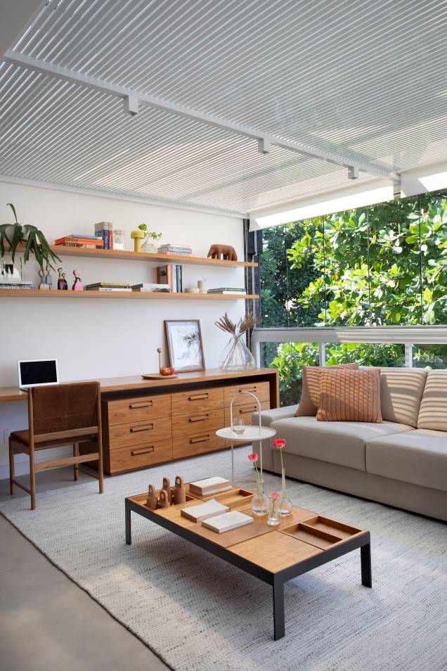 “Basicamente, a transição do ambiente mais formal para o mais descontraído se dá pela diferença de revestimento no forro do teto, pois a varanda ganhou um pergolado de vidro e, sobre ele, uma estrutura ripada branca que suaviza a passagem de luz natural”, explica Juliana.