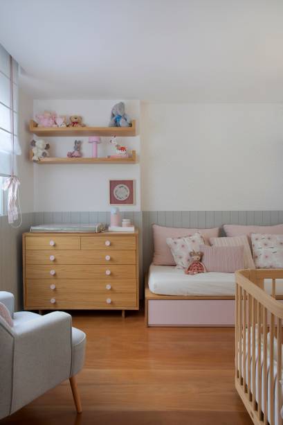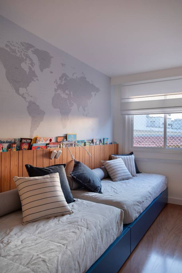 Outro exemplo de ambiente híbrido é a brinquedoteca – embora seja um espaço dedicado aos filhos, também funciona como sala íntima (onde a família se reúne para ver tv) ou quarto de hóspedes, já que conta com um sofá-cama.