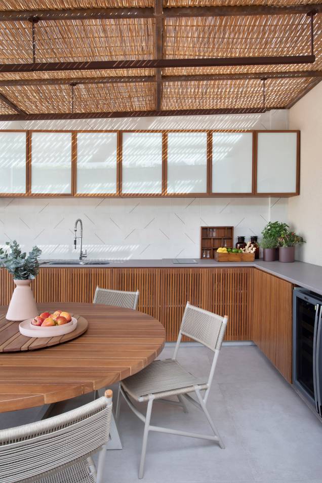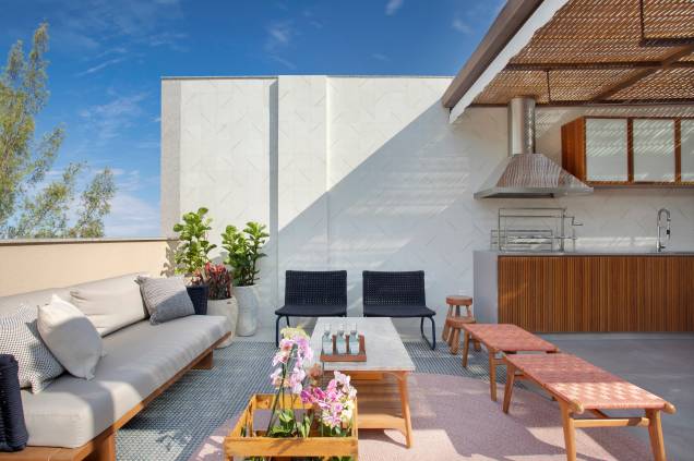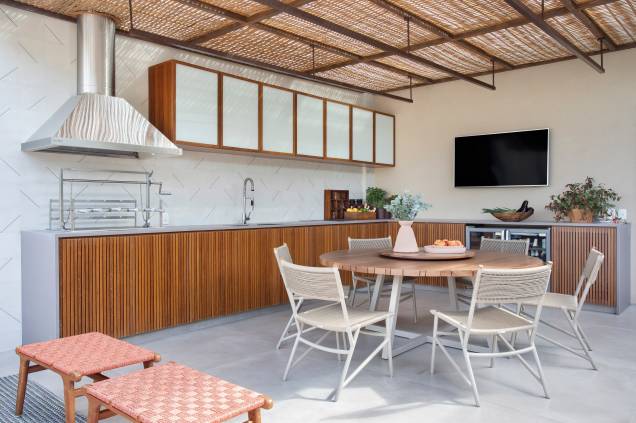 Outro destaque é a parede lateral do estar descoberto que adentra a área gourmet coberta, integralmente revestida com ladrilho hidráulico, trazendo um toque artesanal ao espaço. Já na área gourmet, o destaque fica por conta da cobertura de vidro com a parte interna revestida com uma trama de fibra de dendê, suavizando a presença de luz natural e preservando o conforto térmico.